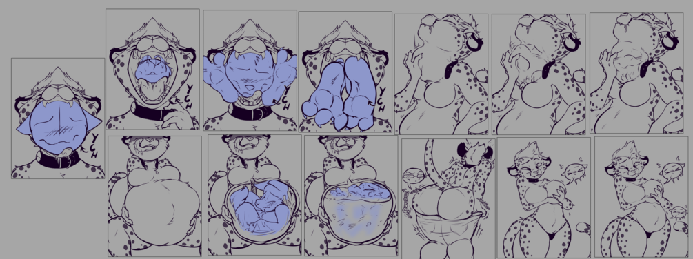 This purchase entitles you to a 3 panel sequence of your choosing, in my signature style. It will NOT be colored. You can choose the panels in any order you want, from a full set of 13, even if it doesn't make sense: for example, you could chose three of the swallowing poses, or three of the post vore poses, 3 inside belly shots, etc. You can even use a different character per panel if you wanted.
